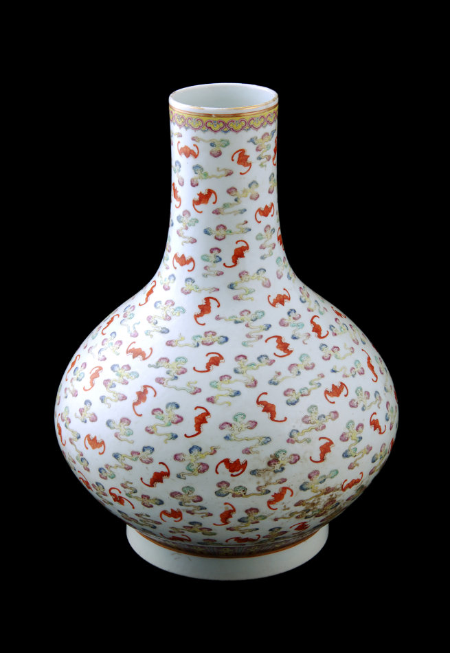 清粉彩百蝠长颈瓶 高33、口径7.3、底径