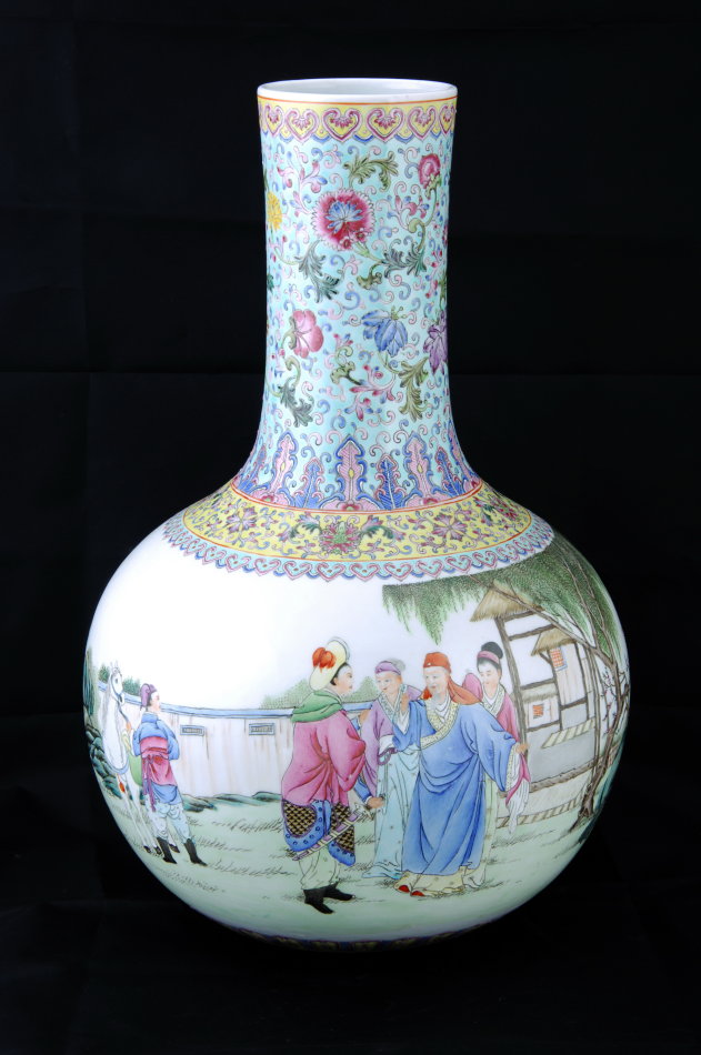 民国粉彩木兰从军天球瓶装饰主题鲜明,让人一睹即可明了。“将军百战死,壮士十年归”,木兰从军,一个人们耳熟能详的中国民间故事。世代以来,从小说到连环画,从我国北朝时期的乐府民歌《木兰辞》到电影《花木兰》(甚至美国也制作了动画片《花木兰》),文学艺术家们以不同的艺术表现形式叙述了同一个故事,成功塑造了一个代父从军、而后身经百战、荣归故里的巾帼英雄形象。《木兰辞》曾列入教育部教学大纲初中生必背古诗词名篇,而“巾帼不让须眉”成了中国家长激励女儿最常用的话语。