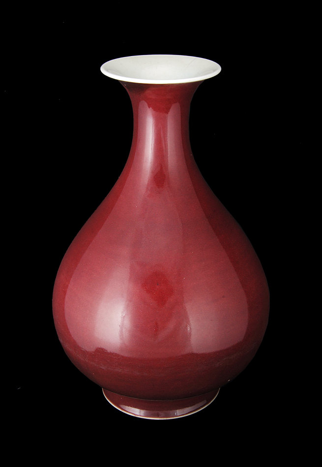 祭红是红釉中的一种,属高温釉,因这种釉色常作祭祀用器而得名。它创烧于宣德年间,虽为单色,但“殷红灼烁,宝光耀目”,釉色匀净,可与红宝石的晶莹相媲美。湛江博物馆馆藏的清乾隆祭红釉玉壶春瓶,釉色鲜艳,釉面均匀,是红釉中的珍品。