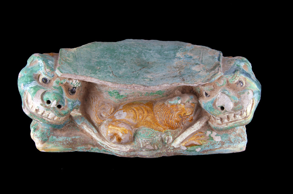 唐三彩,蜚声中外,而宋三彩也并不逊色于它。宋代三彩器较唐代有所发展和创新,它更注重器物表面的装饰艺术,常以印花、贴花、刻划、浮雕等技法作装饰。金三彩双狮头枕,工匠将枕朔成两只卧狮形,枕面、狮头施绿彩,狮身施黄彩,狮眼点黑彩,狮头目光炯炯,咧嘴呲牙,神态逼真,是一件宋三彩珍品。
