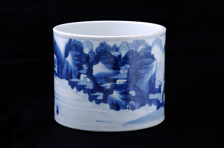 清康熙青花山水人物笔筒 高15.2、口径18.3、底径