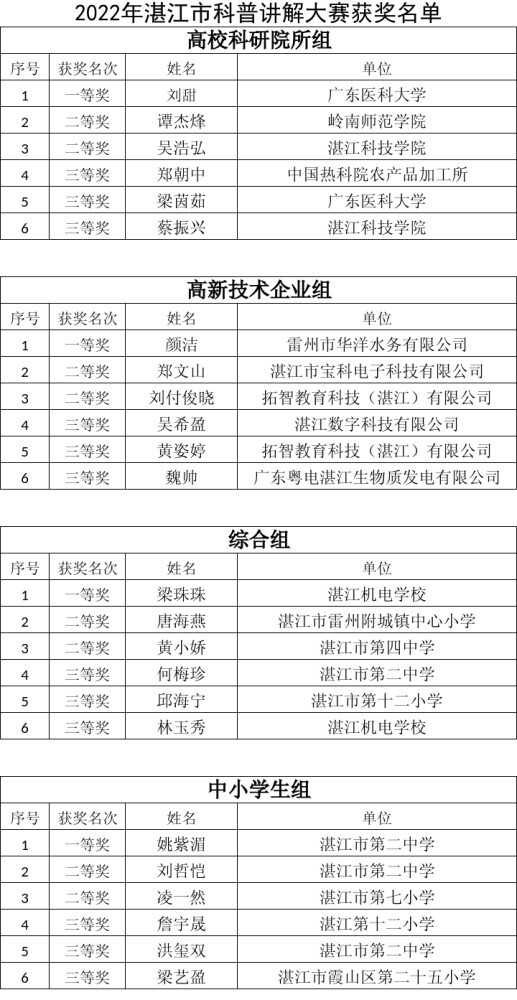 7月27日下午,湛江市科学技术局联合湛江市教育局、湛江市科学技术协会,在湛江嘉瑞禾酒店成功举办2022年湛江市科普讲解大赛暨广东省科普讲解大赛湛江选拔赛。今年是湛江市第二年举办该项赛事,来自湛江各行各业63名选手参赛,以生动的讲解和多媒体展示相互配合,呈现了一场科学与语言深度融合的科普盛宴。整场比赛精彩纷呈,选手们各显身手,为大家呈现了一场有内涵、有意义的精彩比赛。4位选手获得一等奖,8位选手获得二等奖,12位选手获得三等奖。