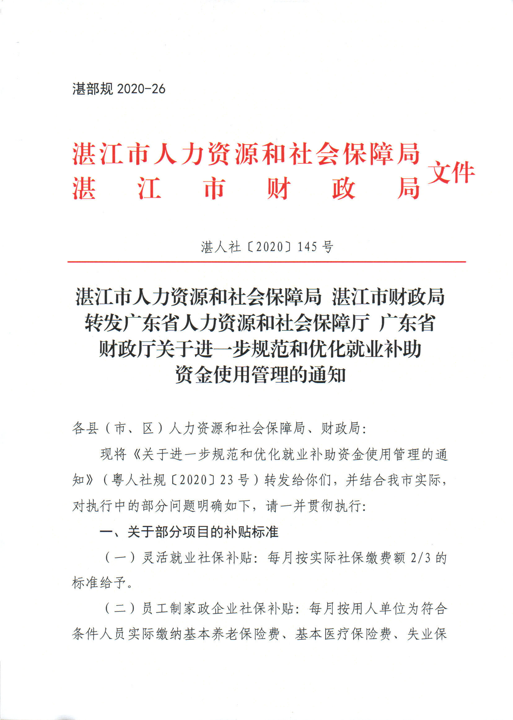 湛江市人力资源和社会保障局 湛江市财政局转发广东省人力资源和社会保障厅 广东省财政厅关于进一步规范和优化就业补助资金使用管理的通知