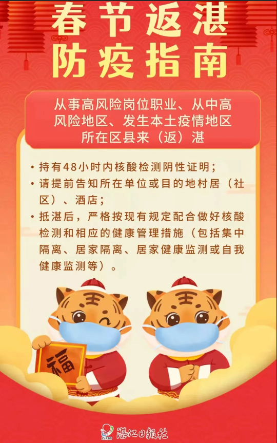 二、减少流动和聚集。春节期间,请广大市民近期不要前往有本土疫情报告地区所在地市旅行及出差。确需前往的,请务必提前向所在社区(村)和工作单位报备。省外旅游、出差返湛后,建议主动做一次核酸检测,并自我观察14天,做好健康监测。减少聚集,尽量不参与聚集性堂食和宴请等。