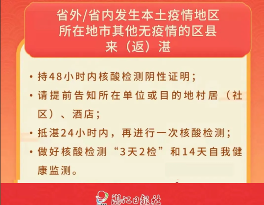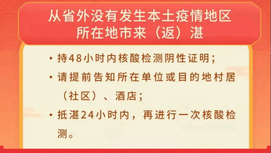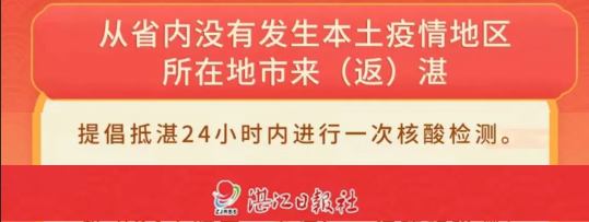 三、提倡从省内外没有本土疫情所在城市来(返)湛人员,到达当天做一次核酸检测。从省外或省内有本土疫情所在城市低风险地区来(返)湛人员,应持有48小时内核酸检测阴性证明,抵湛后尽快向所在村(居)委、单位或所住宾馆报告,严格按现有规定配合做好核酸检测和相应的管控措施。中、高风险地区或高风险地区所在县(市、区)来(返)湛人员,严格按现有规定配合做好核酸检测和相应的管控措施。